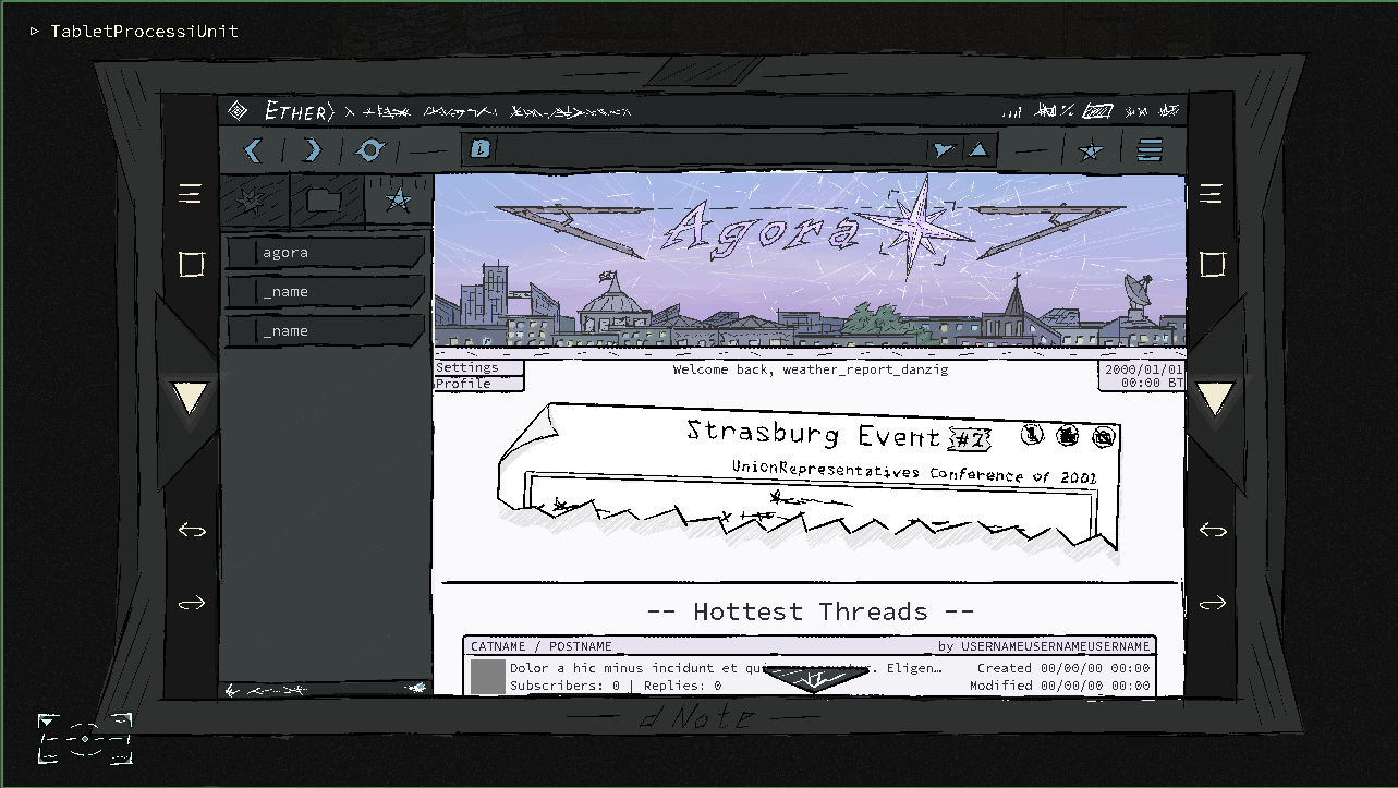 Ah, yes, the website - Agora Forums. It is the beautiful /x/ board of this universe. I already cannot wait to populate it with conspiracy threads and paranormal troll pastas. This website, together with messenger app (from previous devlog), i bet, is already enough to carry several visual novels' worth of content. I could only promise to try and properly include all that simulated /x/-posting into storyline and gameplay. Also, i shall not tell you how long it took me to draw this frontpage banner (a bit longer than your first guess).